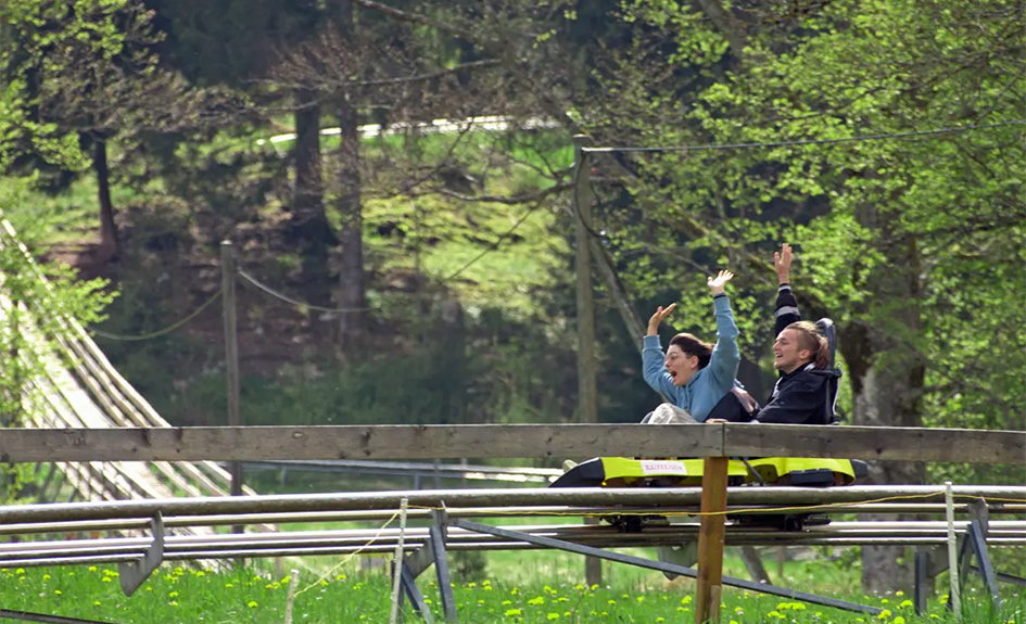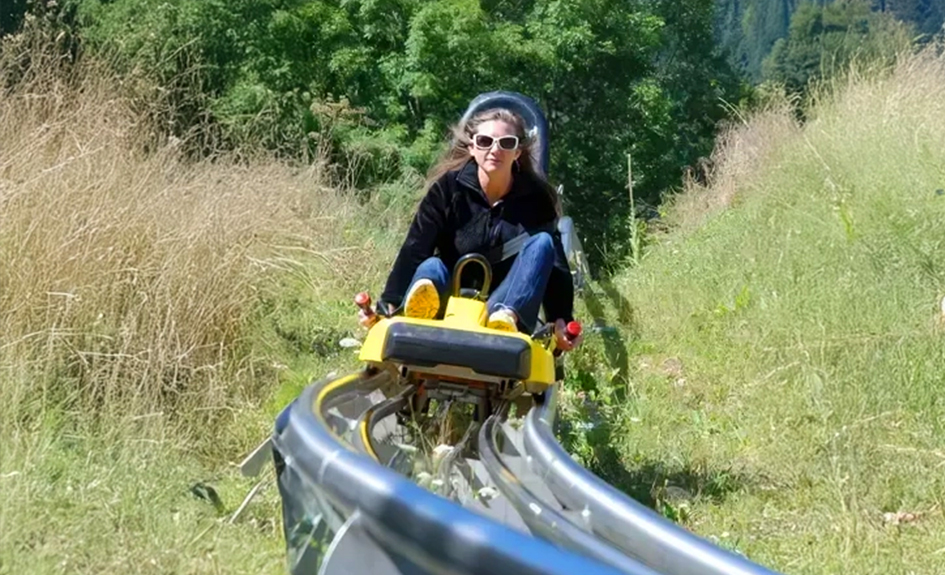 Accrochées à deux rails façon montagne russe, les luges deux places offrent une descente rapide mais toujours maîtrisable, grâce à des manettes de frein intégrées.